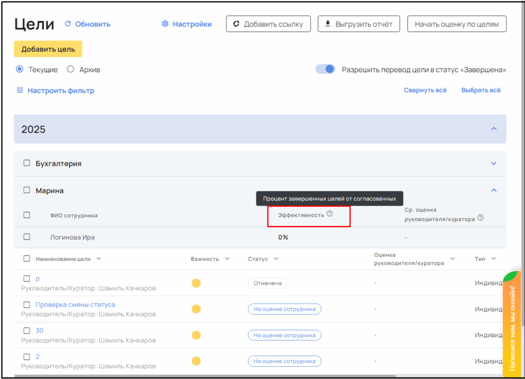 Эффективность рассчитывается по оценке куратора как процент количества целей в статусе «Завершена» от общего количества целей (кроме целей в статус «Отменена») умноженные на 100.