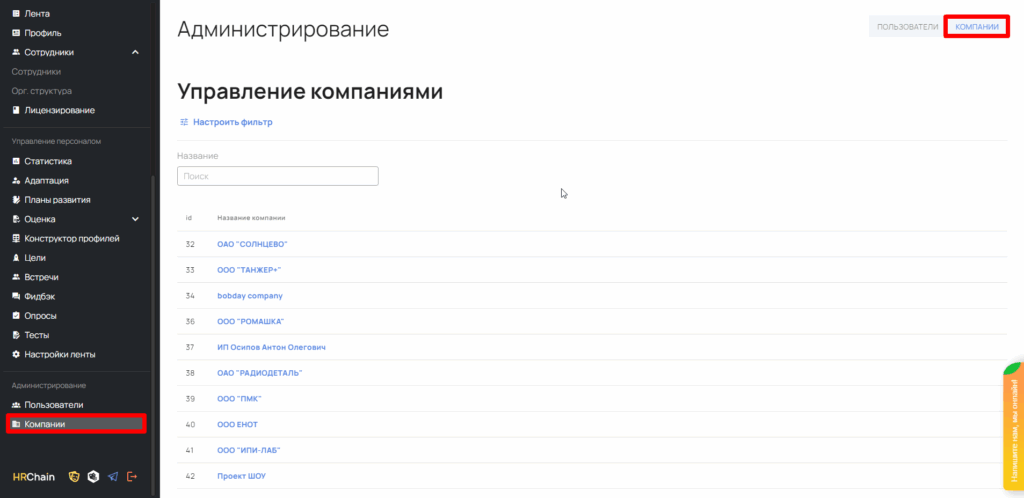 Чтобы открыть страницу управления пользователями в меню выбираем «Компании».